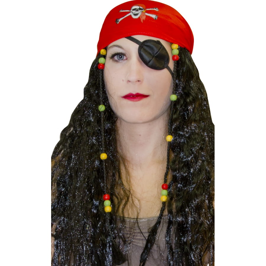 Perruque de pirate mixte, pour homme, femme, adolescent ou adolescente, avec cheveux ondulés de couleur noire agrémentés de perles et foulard rouge avec une tête de mort imprimée dessus. Cet accessoire sera la touche finale qui vous donnera une vrai apparence de pirate.