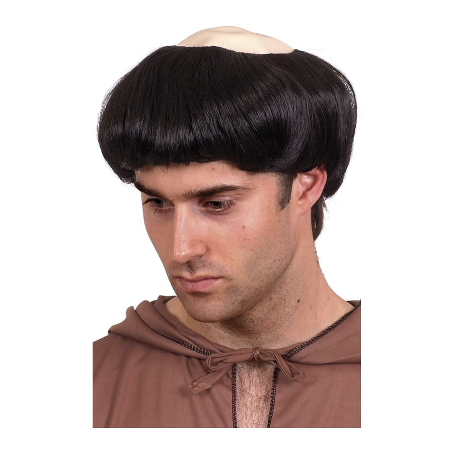 Perruque de moine de couleur noire pour homme. Cet accessoire comprend un faux crâne chauve sur le haut de la tête et des cheveux lisses et noirs qui en sortent. Il changera complètement votre apparence et fera de vous un vrai religieux.