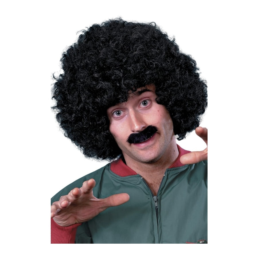 Perruque et moustache de couleur noire pour homme. La perruqe est volumineuse et constituée d'une multitude de boucles. Adoptez le style que vous souhaitez avec ces deux accessoires.