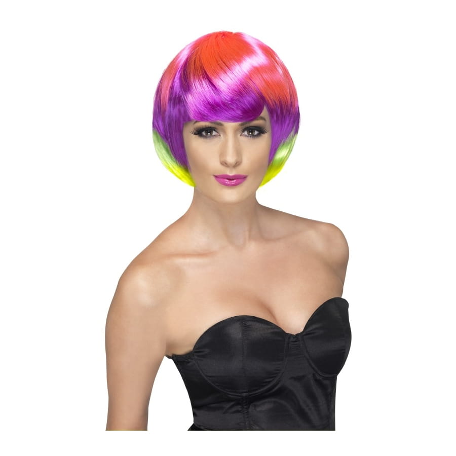 Perruque multicolore funky pour femme. Les cheveux sont coupés au ras du menton avec une frange et la texture est lisse et soyeuse. Les couleurs incluses sont le rose, le violet, le vert et le jaune. A vous d'attirer les regards lors d'une soirée disco ou funky.