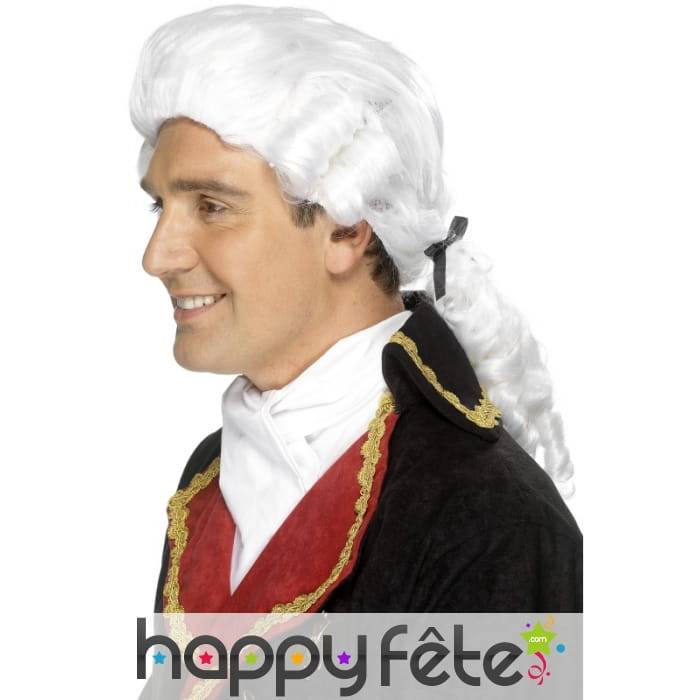 Perruque de noble de couleur blanche pour homme. Cette perruque est constituée de cheveux légèrement ondulés, soigneusement attachés par un ruban noir sur la nuque. Enfilez-la et transformez-vous instantanément en marquis ou en autre personnage du Moyen Age.