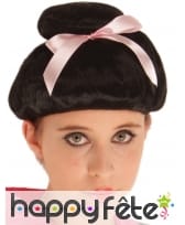 Elle est coiffée d'un chignon en forme de coupe au bol avec un noeud satiné rose qui décore la base.