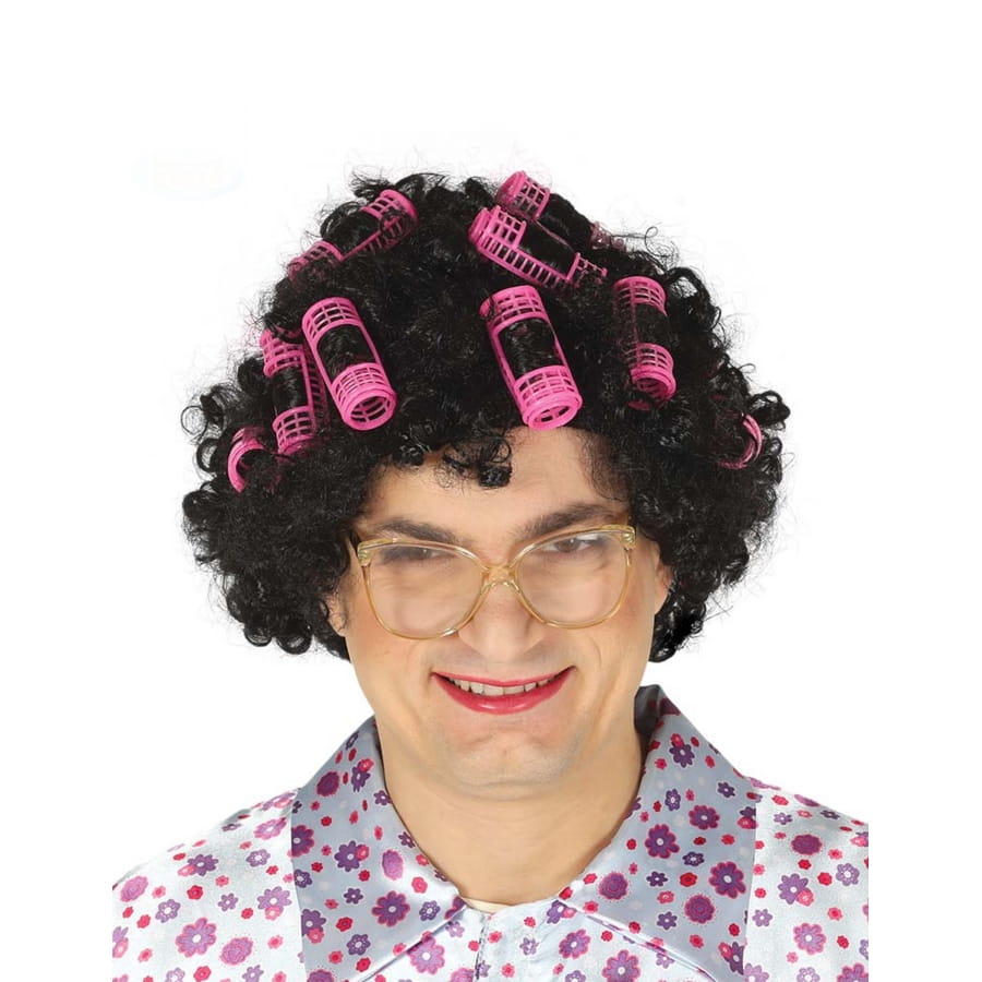 La perruque est constituée de cheveux bouclés noirs, sur lesquels sont accrochés quelques bigoudis roses.