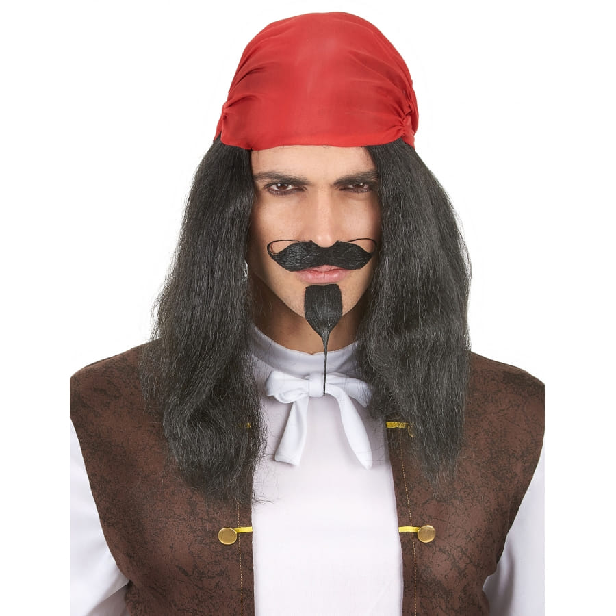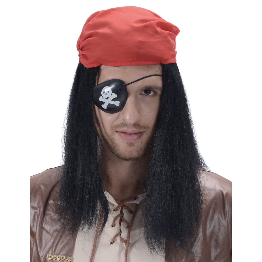 La perruque noire de pirate avec bandana rouge peut être utilisée pour parfaire un déguisement de pirate.