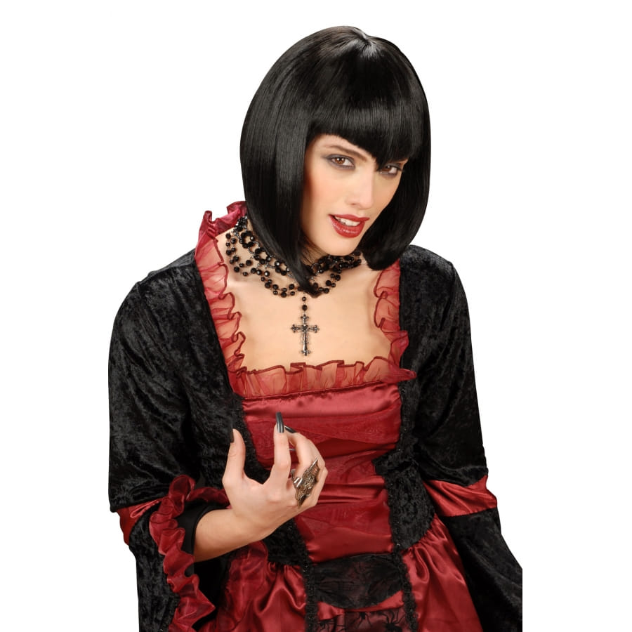 Mesdames, cette année, pour halloween, osez un look gothique. Pour ce faire, nous vous proposons sur notre site cette perruque noire lisse avec frange en pointe. Elle permet d'accessoiriser votre tenue gothique. Cette perruque de couleur noire est courte avec un carré plongeant. De plus, sa longue frange en pointe, du même style que ceux des vampires (en V) vous donnera le parfait look de gothique.