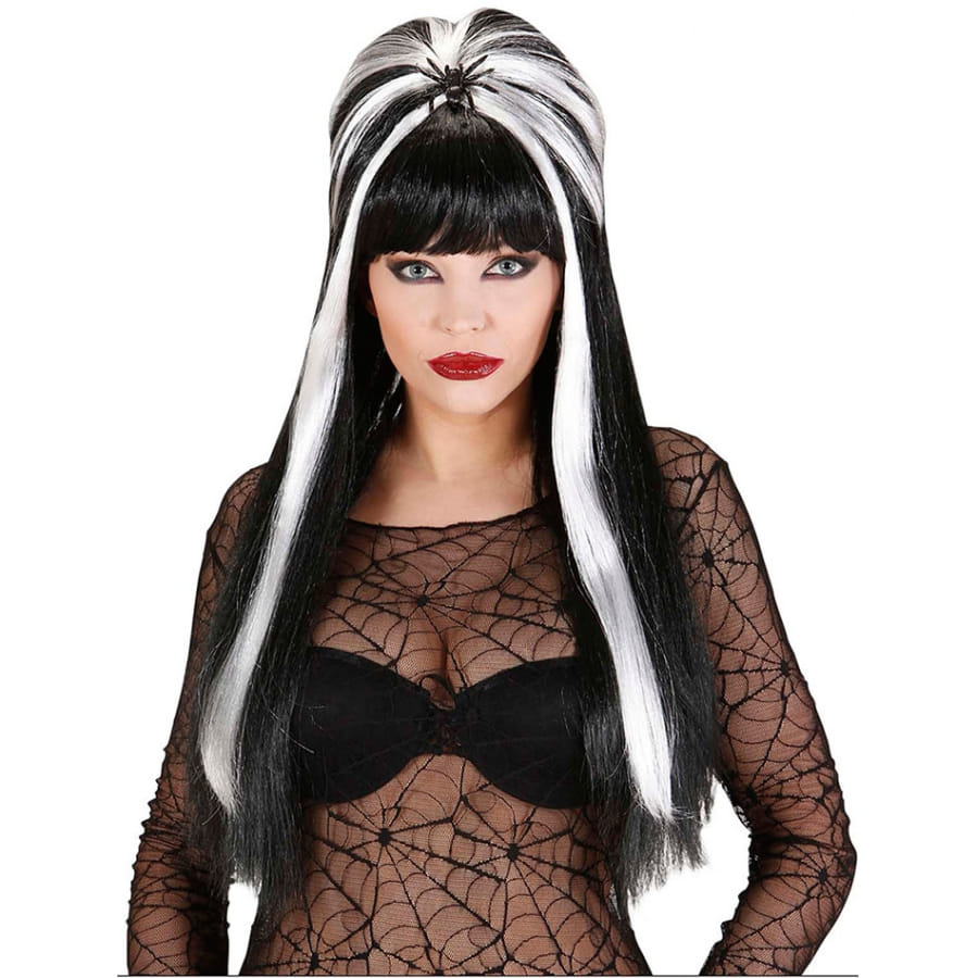 Afin de mettre en valeur votre déguisement et lui apporter une touche d'originalité, nous vous proposons cette perruque noire mèches blanche et araignée que vous pourrez associer facilement à votre tenue.