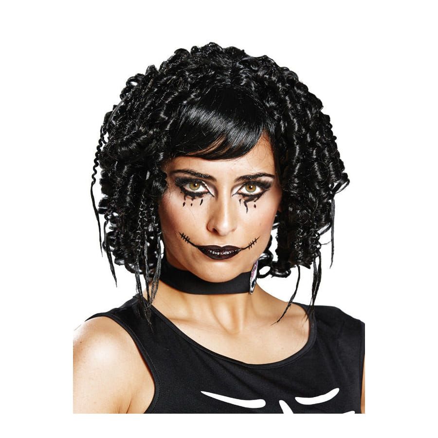 La coiffure est composée de cheveux synthétiques noires et frisés qui vous arriveront au niveau du cou.