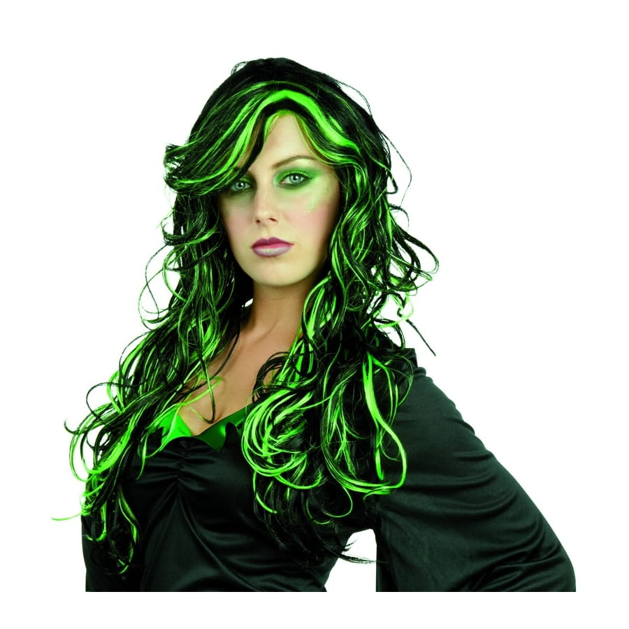 La perruque ondulée noire et mèches vertes est formée par une longue chevelure ondulée, de couleur noire, avec des mèches vert fluo un peu partout.