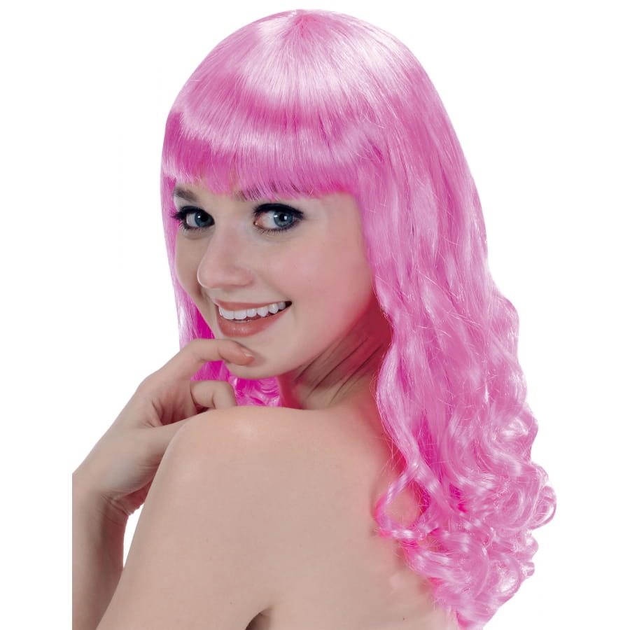 La perruque ondulée rose mi-longue est constituée de cheveux synthétiques.