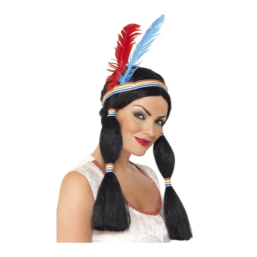 Vous êtes à cours de déguisement? Et bien avec cette perruque tressée (nattes sur les côtés et bandeau à plumes), vous n'aurez pas le temps d'enfiler votre déguisement que tout le monde vous prendra déjà pour une princesse indienne.