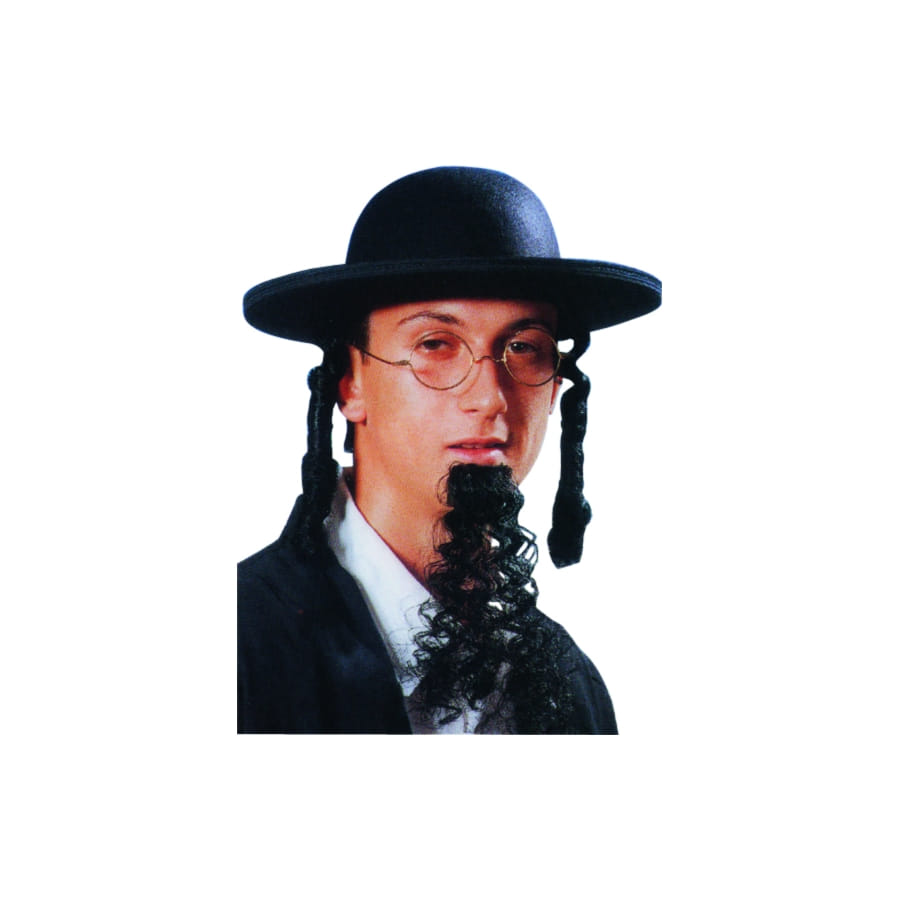 Perruque, bouc, chapeau et boucles de Rabbi Jacob. Cet ensemble d'accessoires pour homme est de couleur noire. Transformez-vous complètement en religieux juif pour un carnaval ou une fête déguisée.