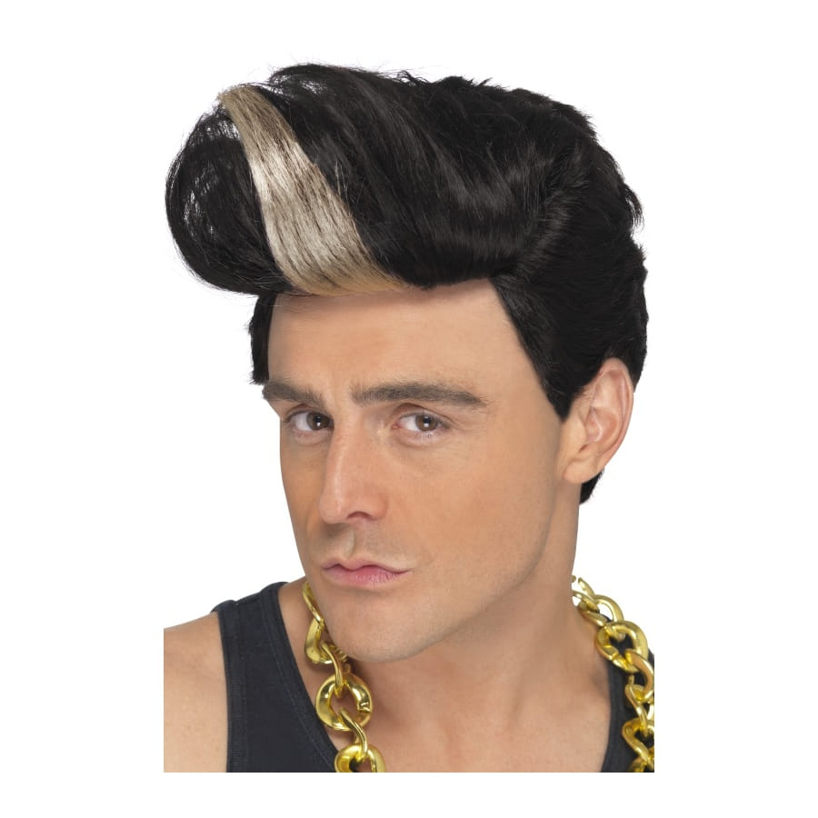 Perruque de rappeur des années 90 pour homme. Les cheveux sont de couleur noire, coiffés en "banane", avec une unique mèche blond platine sur l'avant. Ajoutez-y des accessoires bling bling tels que ceux proposés pour un look parfait de rappeur rétro.