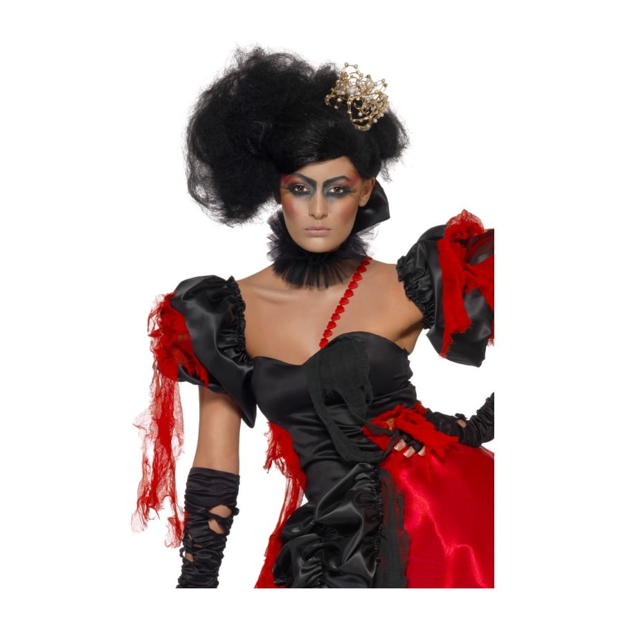 Perruque de Reine de Coeurs Brisés, pour femme. Les cheveux sont de couleur noire, coiffée de façon assez excentrique en chignon sur le côté. Enfilez cette perruque et déguisez-vous en marquise au style louffoque.