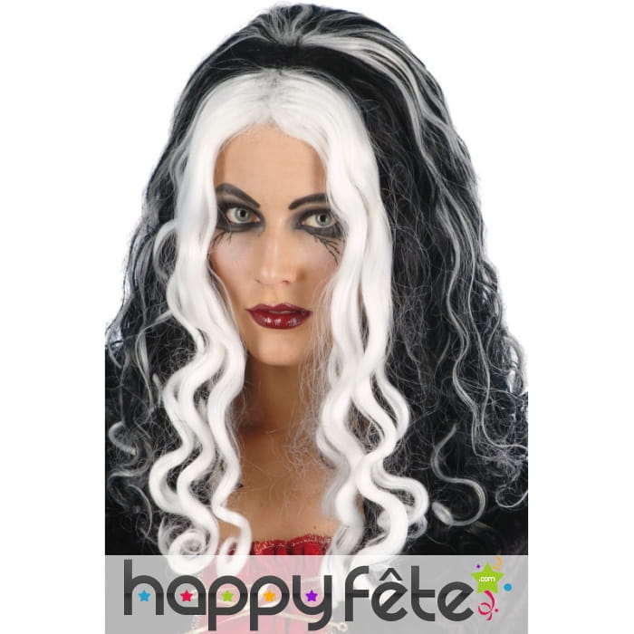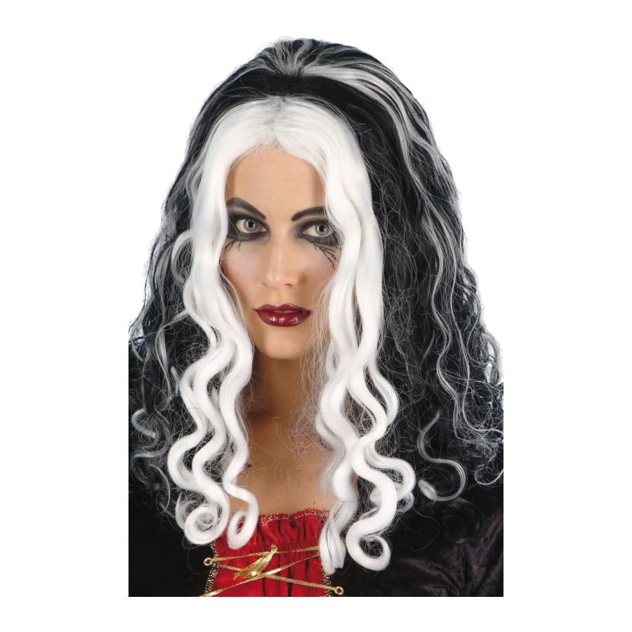 Pour peaufiner votre déguisement de sorcière vous aurez besoin de cette perruque reine de sorcière. Les cheveux sont ondulés et arrive jusqu'aux épaules, de couleur noir avec des mèches blanches, elles sont plus épaisse sur le devant. Cette perruque est parfaite pour incarner une sorcière ou si vous partez a une fête ayant pour thème la magie.