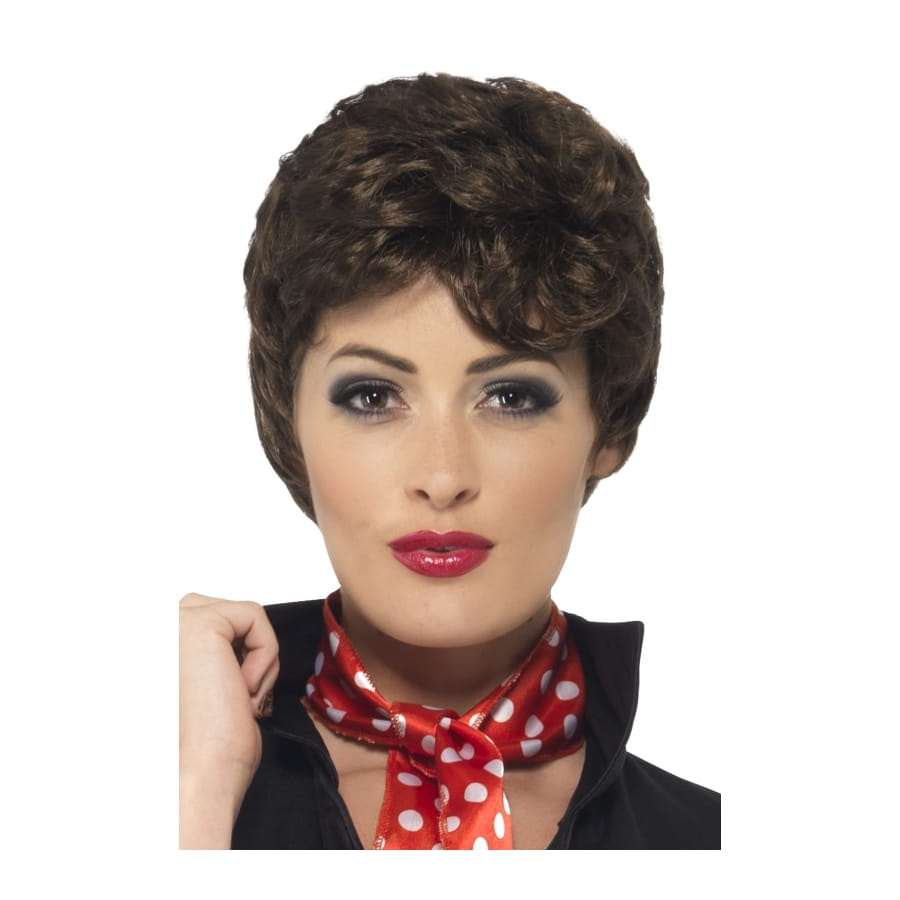 Une fête de la musique en chansons ! Entrez dans la peau de Betty Rizzo de Grease. Voici sa belle chevelure, mise à votre disposition ! Il s'agit d'une splendide perruque de couleur marron, qui encadre bien la frimousse. Les cheveux sont courts, et quelques mèches forment une petite frange sur le devant. Ce produit vous est proposé en taille unique.