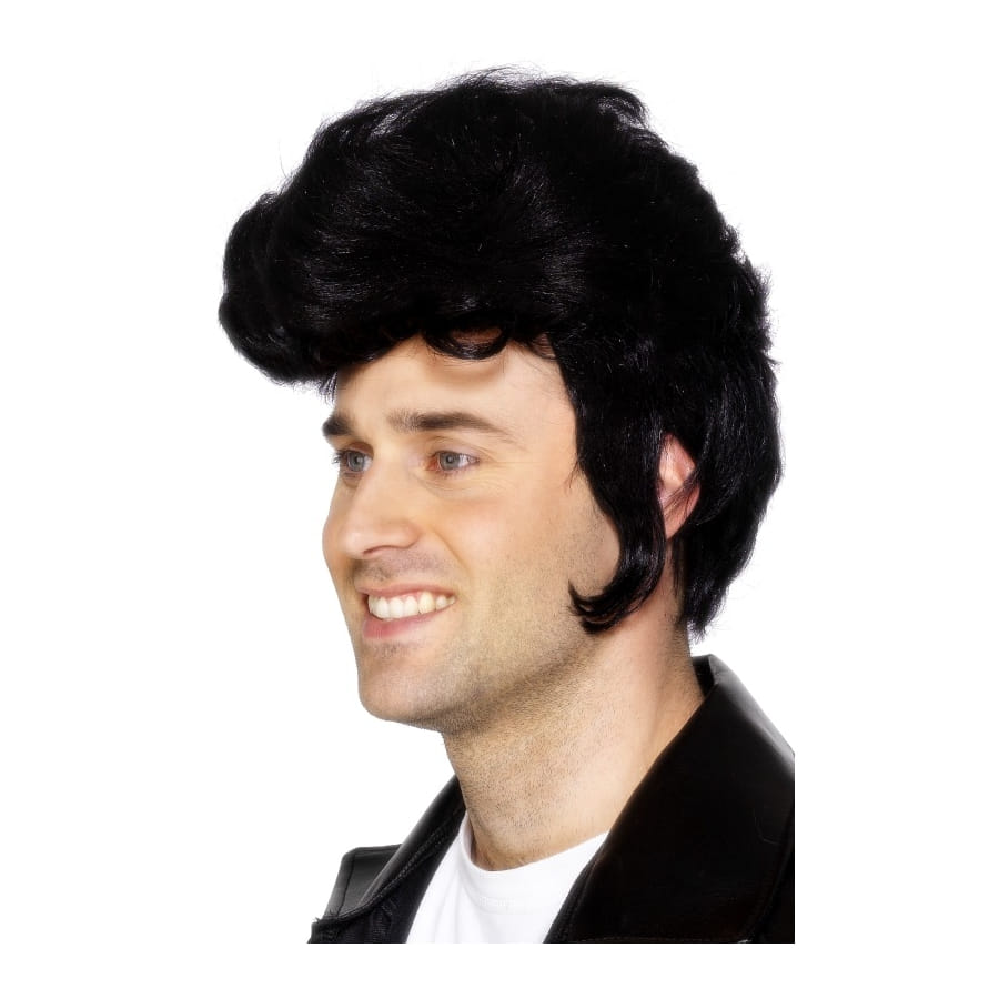 Perruque de rockstar de couleur noire pour homme. La perruque est coiffée en banane et d'épais favoris. Déguisez-vous en "Danny" du film "Grease" ou en autre star du Rock'n Roll.