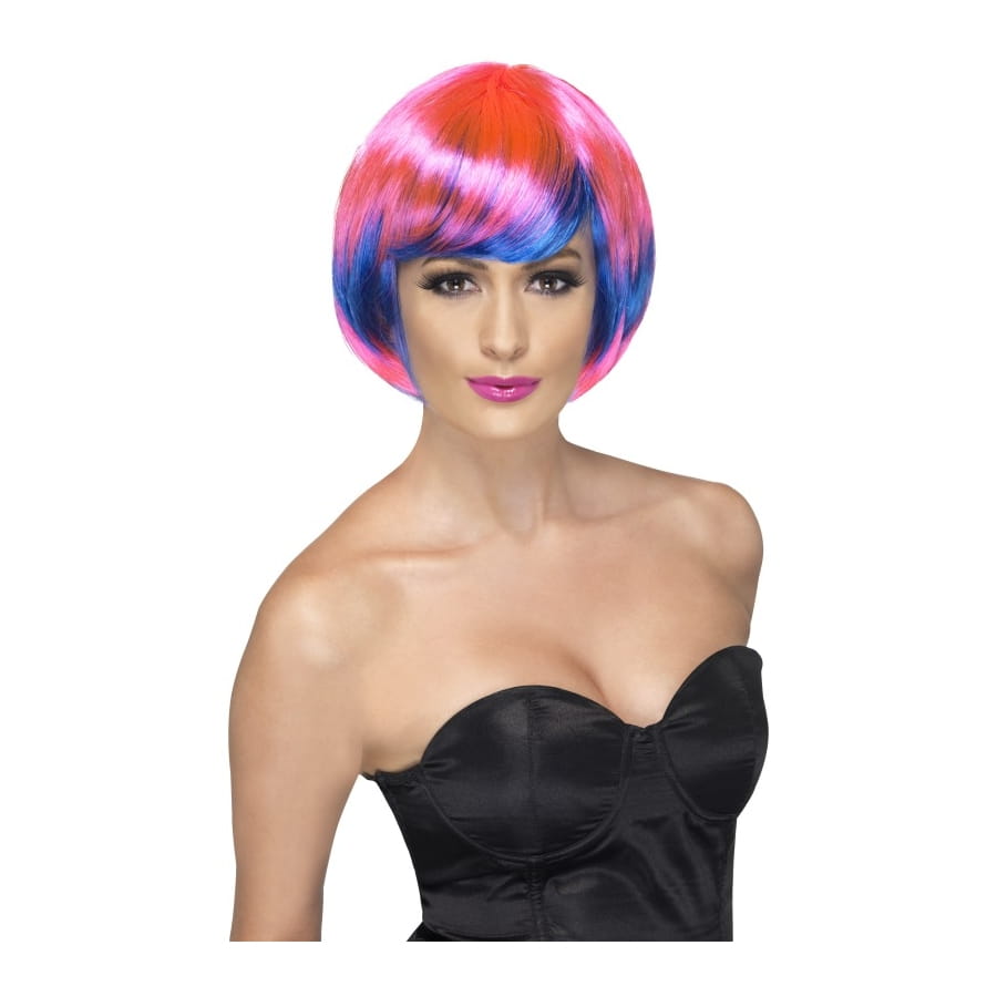 Pour le carnaval pourquoi ne pas porter cette perruque de couleur rose et bleu ou encore pour un enterrement de vie de jeune fille. Cette perruque a une frange sur le coté et elle est lisse.