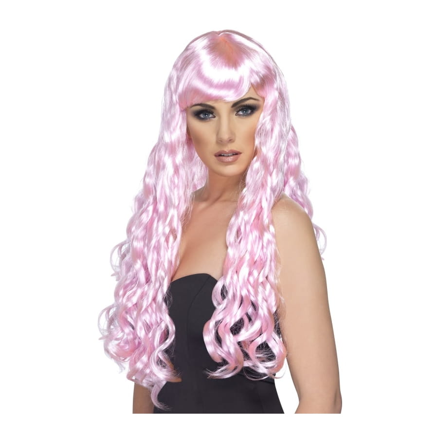 Perruque de couleur rose bonbon pour femme. Cet accessoire est constitué de très longues mèches bouclées arrivant à la taille et d'une frange lisse. Adoptez un look singulier pour attirer le regard de la foule.