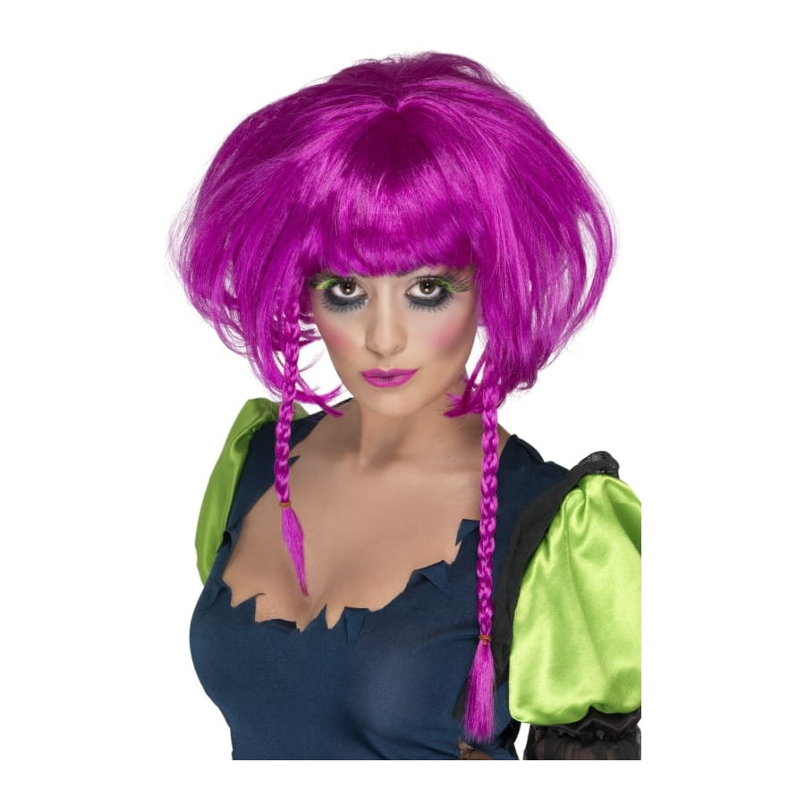 Perruque de couleur violet fluo pour femme. Les cheveux sont désordonnés, coupés courts avec une frange et deux longues tresses de la même couleur. Elle vous donnera un air effrayant et légèrement dérangé, ce qui sera très utile pour un déguisement d'Halloween.