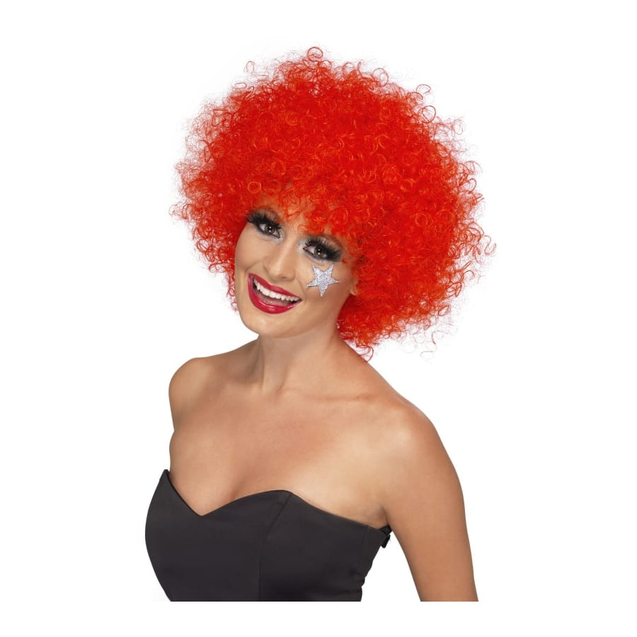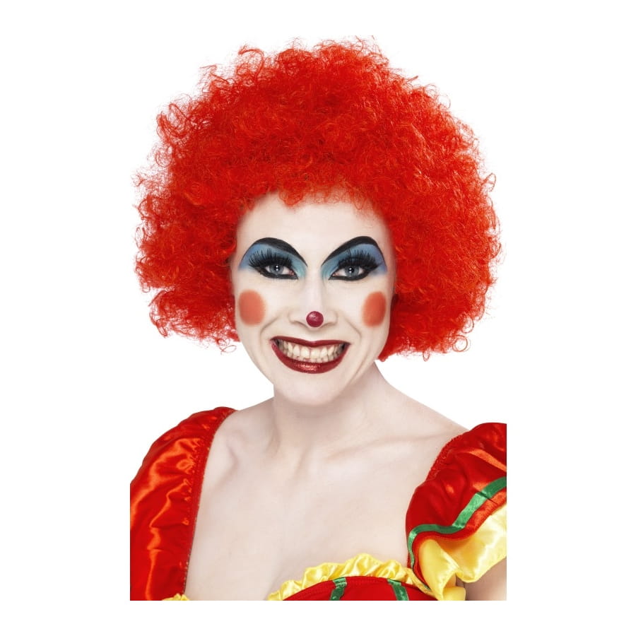 Perruque de clown de couleur rouge pour femme. Cette perruque vous donnera un air drôle et amusant grâce aux boucles frisées et à sa taille.