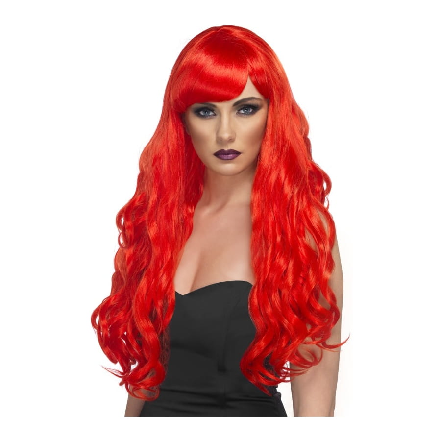 Perruque de couleur rouge pour femme. Cette perruque est constituée d'extrêmement longues boucles soyeuses et d'une frange lisse. Cette couleur ira parfaitement à un déguisement de diablesse ou de démon pour Halloween.