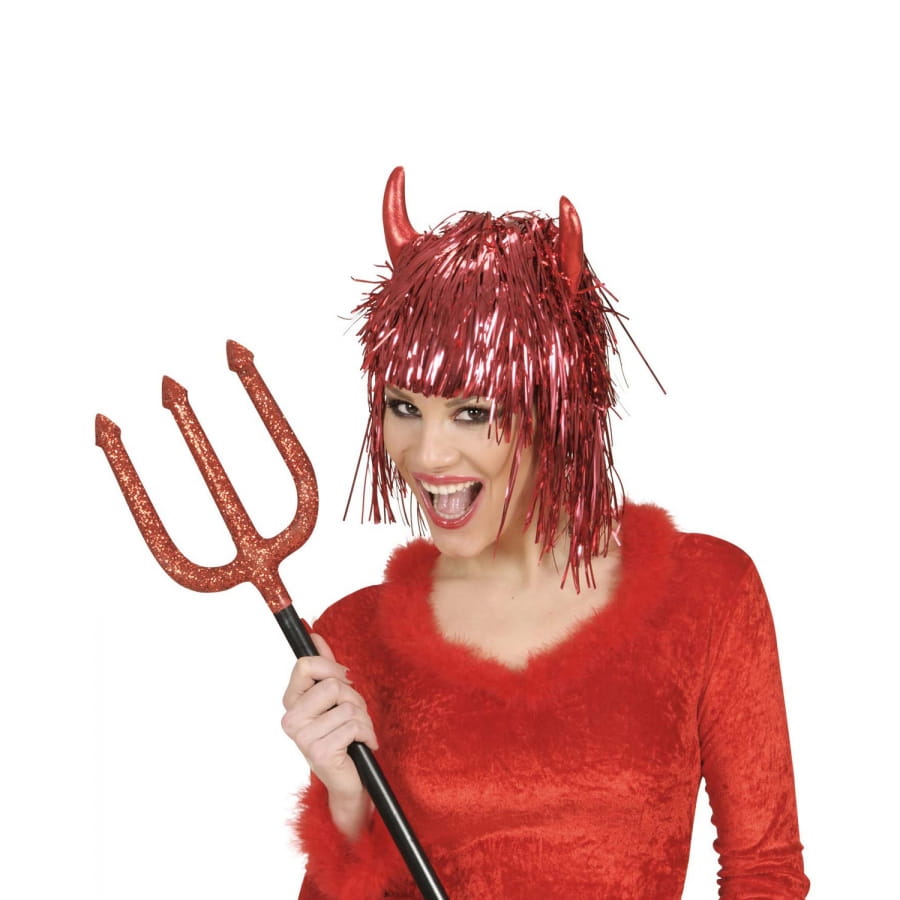 La perruque rouge métallique avec cornes de diable est un accessoire destiné aux adultes.