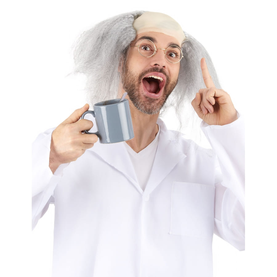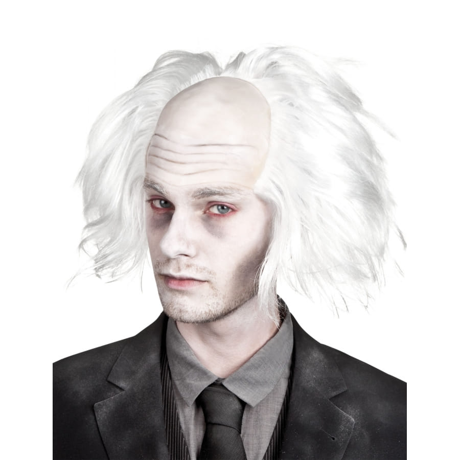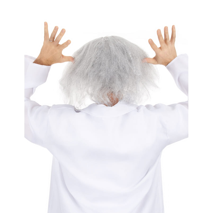 Cette perruque semi-chauve grise de fou vous mettra dans la peau d'un homme âgé comme les savants de laboratoire. Elle comprend des cheveux blancs avec des nuances de gris et d'un faux crâne en plastique rattaché à l'ensemble. Ce faux crâne donnera un front effet ridé qui accentue le côté vieux du personnage. Cet accessoire est parfait pour accompagner votre déguisement d'halloween.