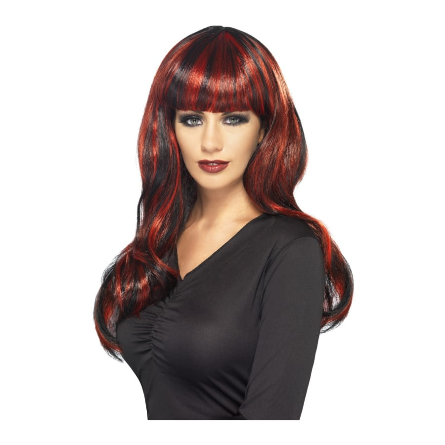 Magnifique perruque de sirène, de couleur rouge et noire, pour femme. Cet accessoire est constitué de longs cheveux légèrement ondulés et d'une frange Les cheveux sont principalement rouges, mais striés de mèches noires. A vous de faire tomber les hommes avec cet accessoire!