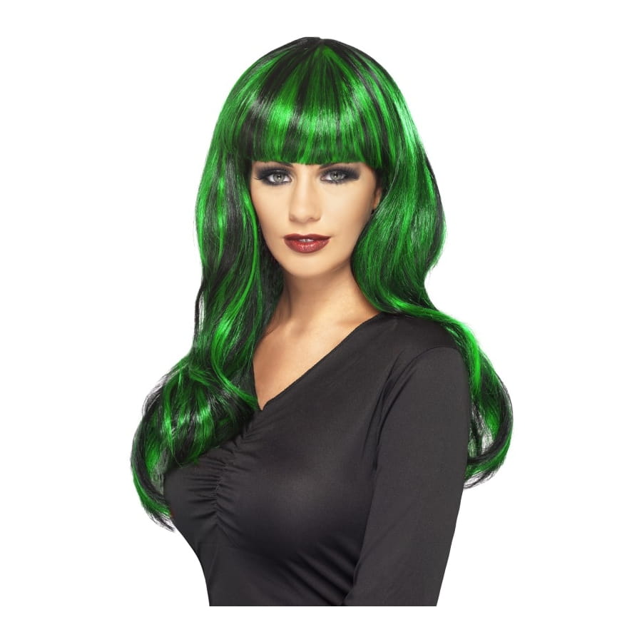 Longue perruque de sirène, avec frange, pour femme ou adolescente. Cette perruque est composée de cheveux très légèrement ondulés entièrement verts avec mèches noires. Vous pourrez l'utiliser pour vous déguiser en magnifique sirène ou en méchante sorcière.