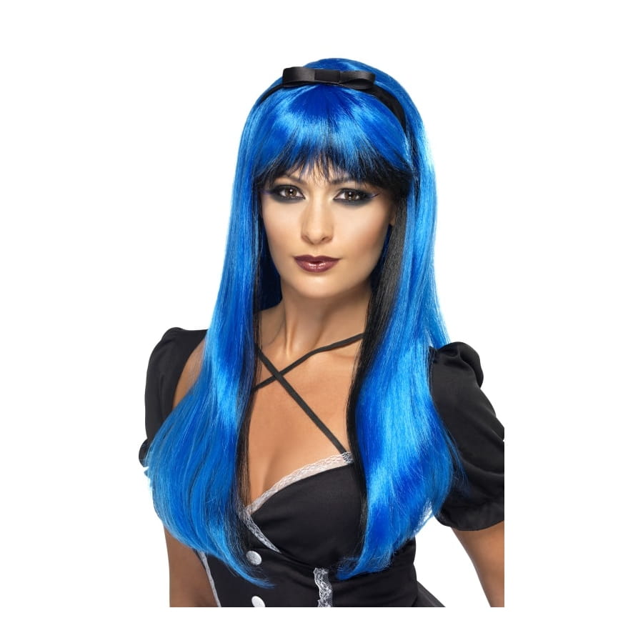 Longue perruque de sorcière aux cheveux bleu électrique avec frange et mèches noires, pour femme ou adolescente. Cet accessoire vous permettra de compléter un déguisement de sorcière pour Halloween ou de personnage de monde fantaisiste pour d'autres fêtes déguisées.