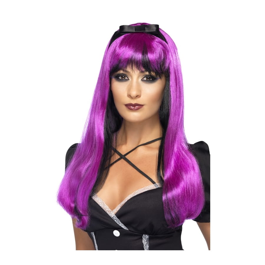 Perruque de sorcière de couleur violette et noire, pour femme. Cet accessoire est constitué de longs cheveux droits et d'une frange, principalement violets mais avec de fines touches noires. Votre déguisement de sorcière attirera plus l'attention par son côté glamour que par son côté effrayant.