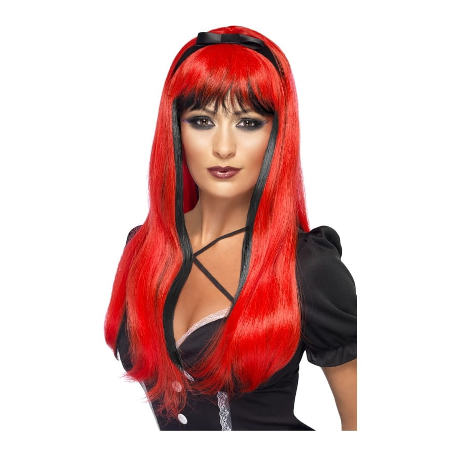 Perruque de sorcière pour femme. Cet accessoire est composé de cheveux longs et droits de couleur rouge, avec une frange et des mèches noires en dessous. Avec sa couleur flamboyante, vous serez sûr que votre déguisement ne passera pas inaperçu. Tenez-la hors de portée du feu.