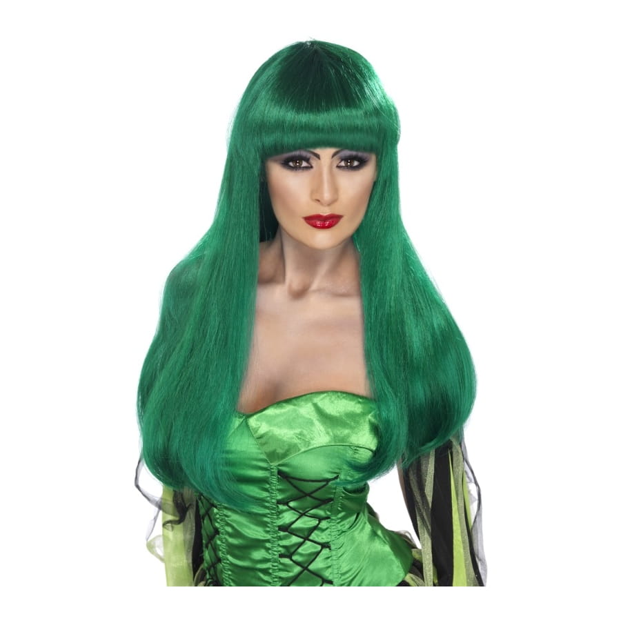 Perruque de sorcière de couleur verte avec frange, pour femme ou adolescente. Cette maginifique perruque comporte des cheveux droits et lisses. Vous pourrez la porter pour Halloween ou à l'occasion de la Saint Patrick.