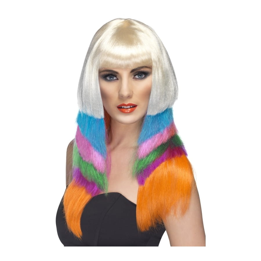 Perruque de starlette excentrique multicolore avec frange pour femme. Les cheveux sont lisses et droits, avec un haut blond platine et des mèches bleues, roses, verte, violettes et orange. Vous serez sûre de ne pas passer inaperçue avec cet accessoire.