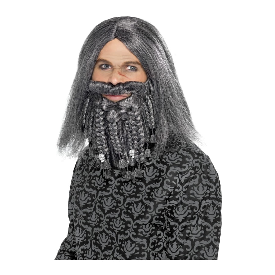 Set de terreur des mers composé d'une perruque et d'une barbe de couleur grise pour homme. La perruque est lisse et arrive aux épaules tandis que la barbe est entièrement tressée, avec de petits crânes comme ornements. Avec ce set, vous deviendrez instantanément le terrible "Barbe Grise".