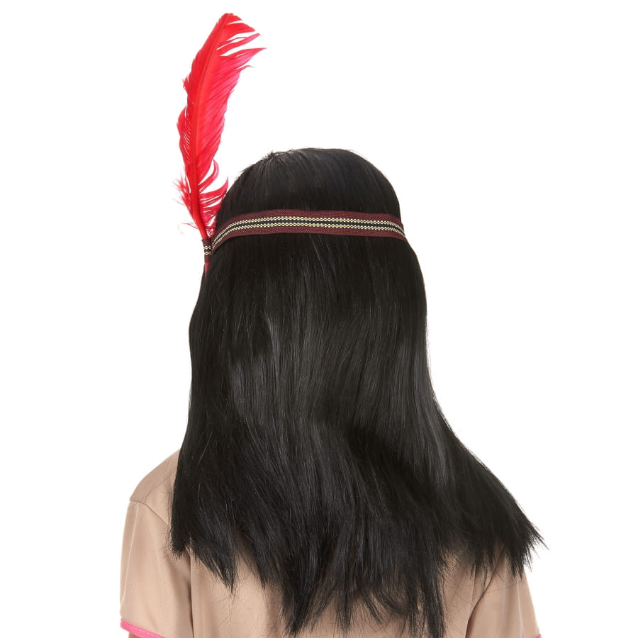 La perruque est accessoirisée d'un bandeau rouge, jaune et noir ainsi qu'une plume rouge synthétique sur le côté.