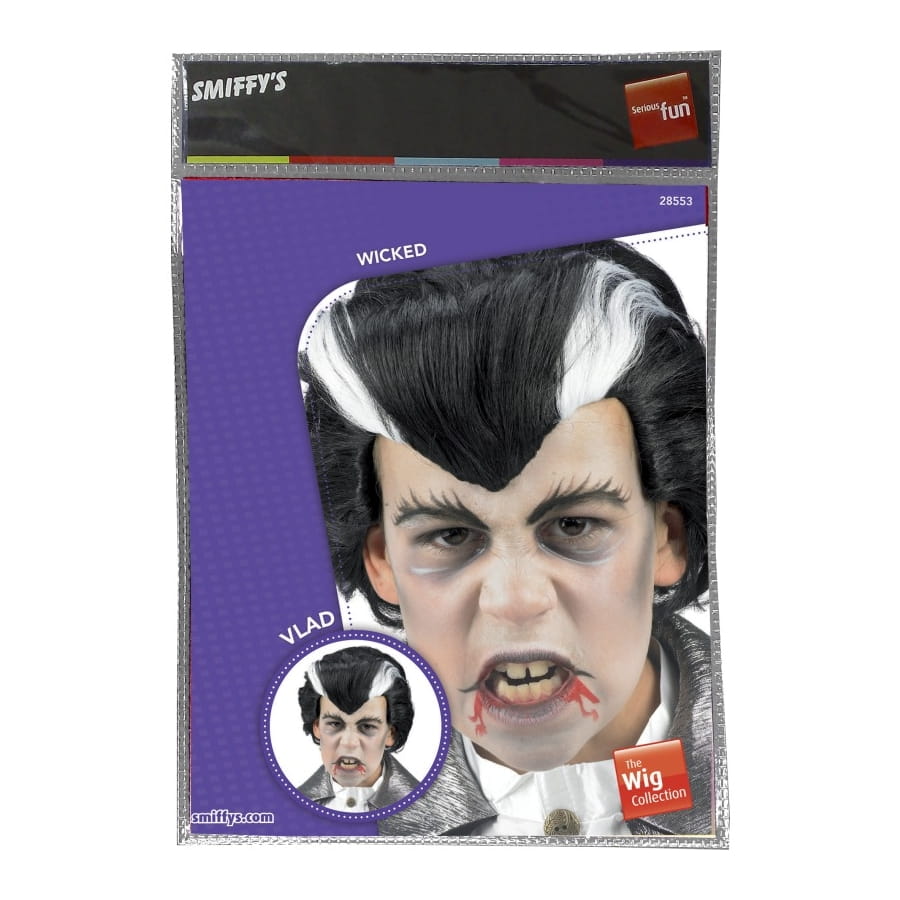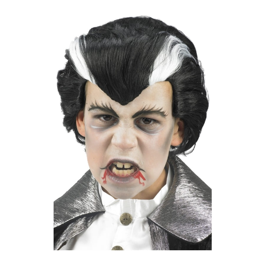 Votre enfant incarne un vampire pour Halloween pourquoi ne pas lui faire porter cette perruque de vampire. Cette perruque est courte, de couleur noire avec une mèche blanche de chaque coté.