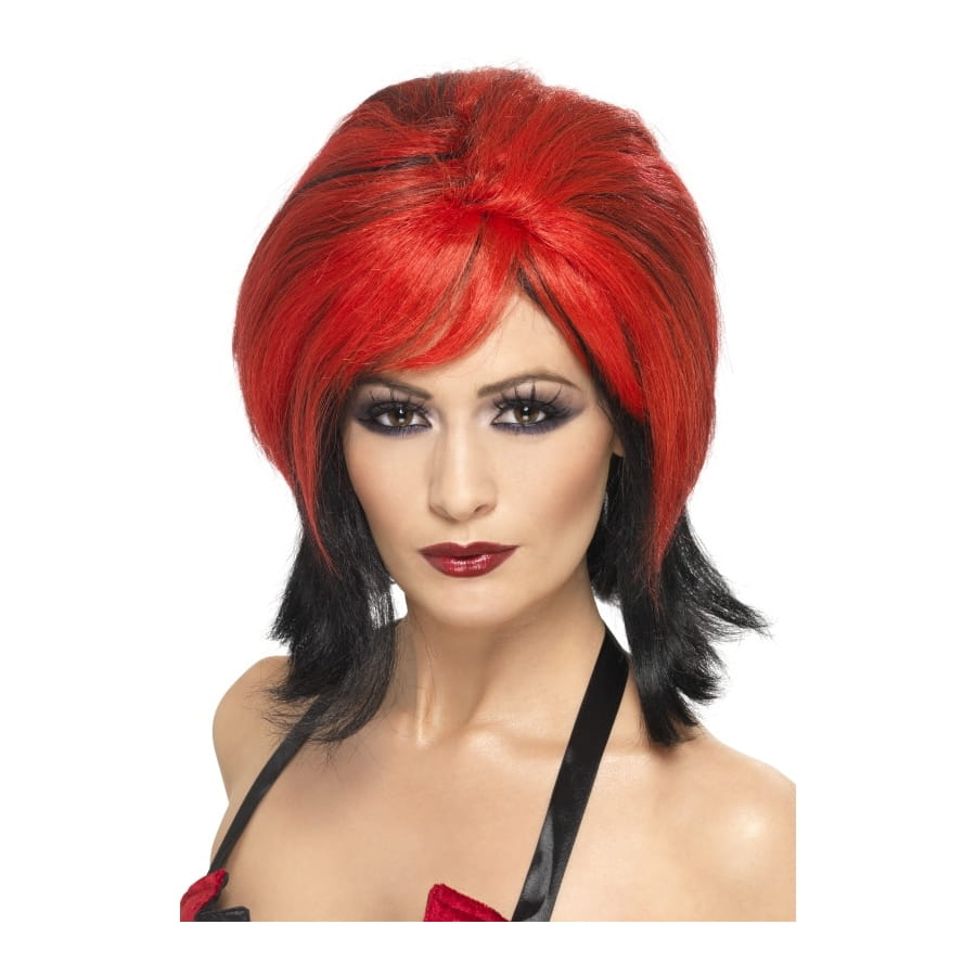 Perruque de vampire de couleur rouge et noire pour femme. Les cheveux sont courts, rouges sur le haut et noir en-dessous. Ils ajouteront une touche gothique et maléfique à votre déguisement de sorcière, de vampire ou de diablesse.