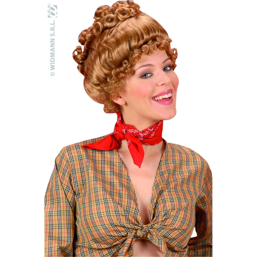 Perruque Lucy pour femme coiffée en chignon bouclé style Western Country. Ajoutez une touche Western à votre tenue en enfilant cette perruque!