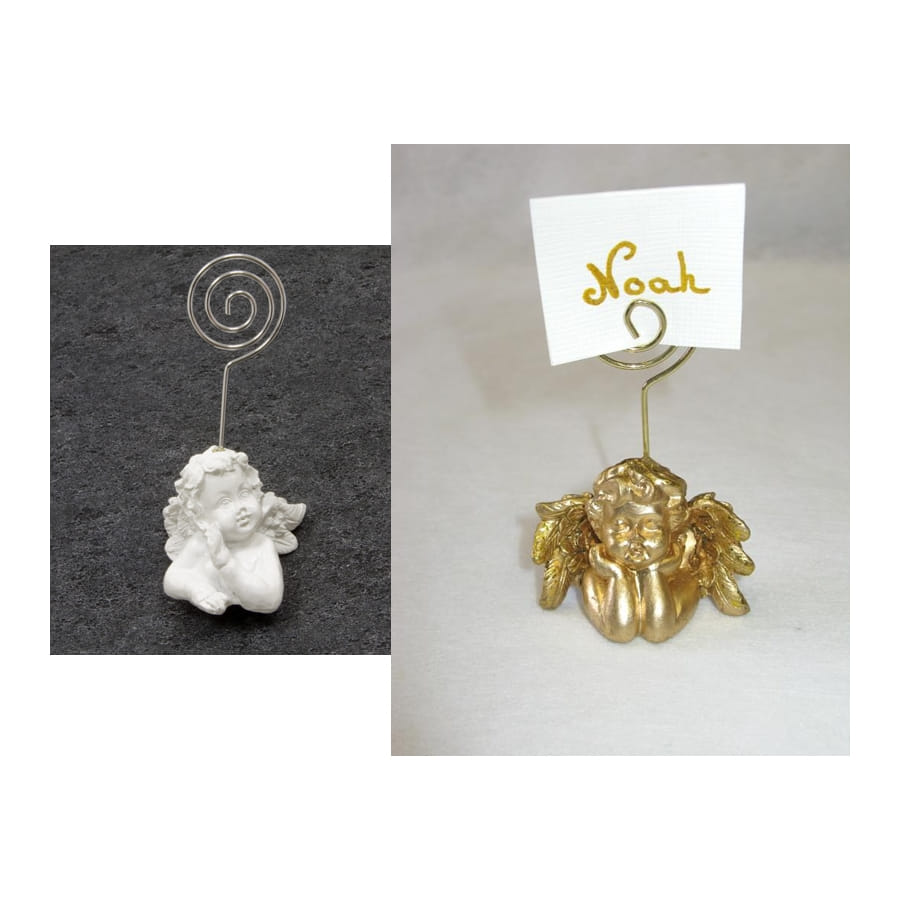 Conviez des anges pour la célébration de votre événement. Mariage, baptême, naissance, Saint-Valentin, etc. il existe tellement d'occasions pour utiliser ce petit ange marque place. Il s'agit d'un petit ange de couleur blanche ou dorée, surmonté d'une sorte de spirale qui vous permettra de le fixer au papier ou au carton sur lequel vous aurez inscrit le nom de votre invité.