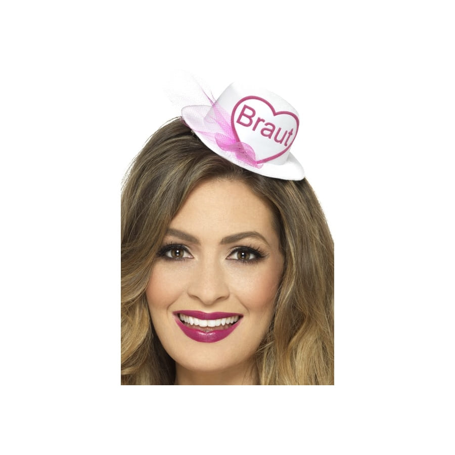 Pour votre soirée d'enterrement de vie de jeune fille, ajoutez un accessoire très mignon à votre tenue. Nous proposons pour les femmes ce petit chapeau Braut blanc sur serre tête. Il est de couleur blanc avec une étiquette en forme de coeur à bordure rose avec l'inscription "Braut" (la future mariée) à l'intérieur et un petit voile rose pour le décorer. Le chapeau est fixé sur un serre-tête.