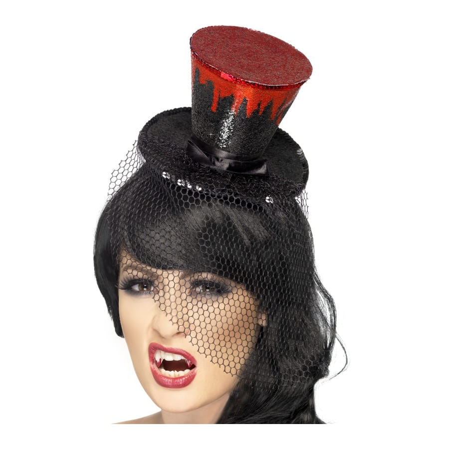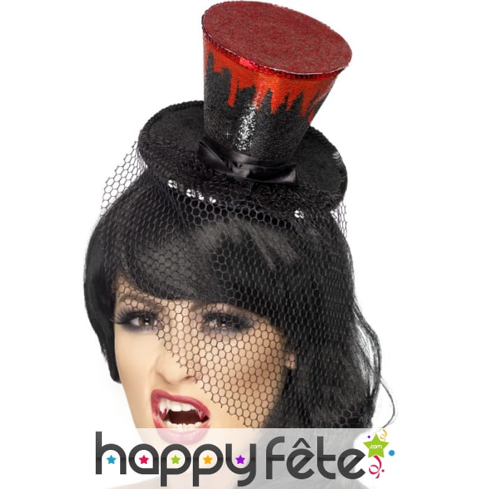 Petit chapeau ensanglanté de couleur rouge et noire, avec voile, pour femme ou adolescente. Ce chapeau conviendra parfaitement pour une soirée d'Halloween. Il est particulièrement idéal pour compléter une tenue de vampire.