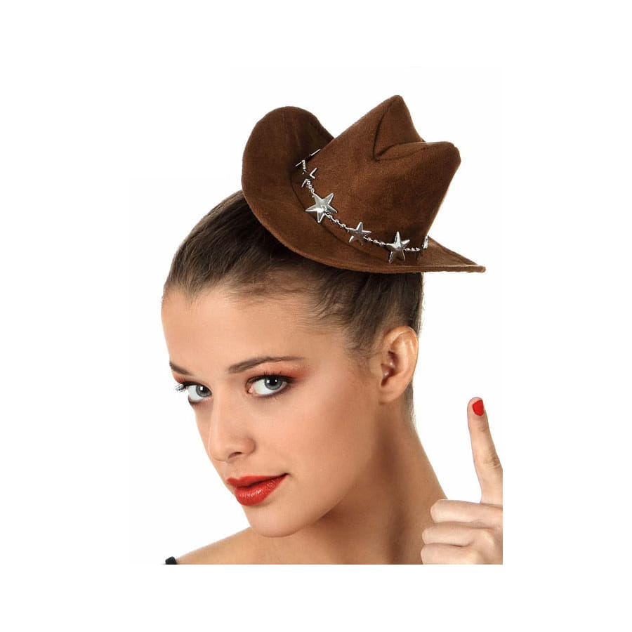 Notre Petit chapeau marron de cowboy sur pince pourrait bien être l'accessoire choc de votre déguisement de cowgirl.