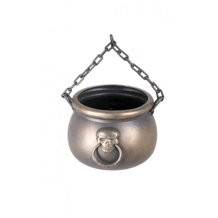 Si vous voulez mettre la main sur une décoration originale pour halloween, essayez le petit chaudron décoré d'une tête de mort, 19cm. De forme arrondie, il se compose uniquement de plastique de couleur argent, avec des nuances dorées. Il fait environ 19 cm de large et 13 cm de hauteur. Muni d'une chaîne pour le suspendre et décoré de tête de mort en relief, il demeure la touche déco idéale pour la fête des morts !