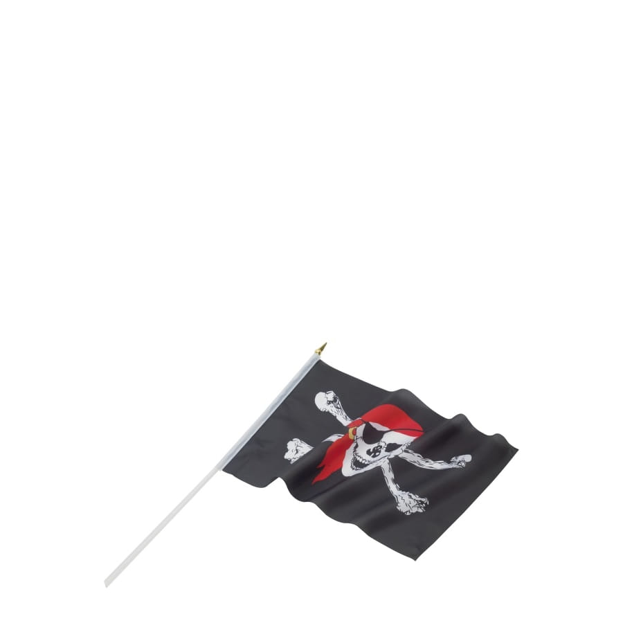 Petit drapeau de pirate de couleur noire, imprimé d'une tête de mort blanche portant un foulard rouge. Avec cet accessoire, votre enfant pourra marquer son territoire de pirate ou l'emplacement de son trésor!