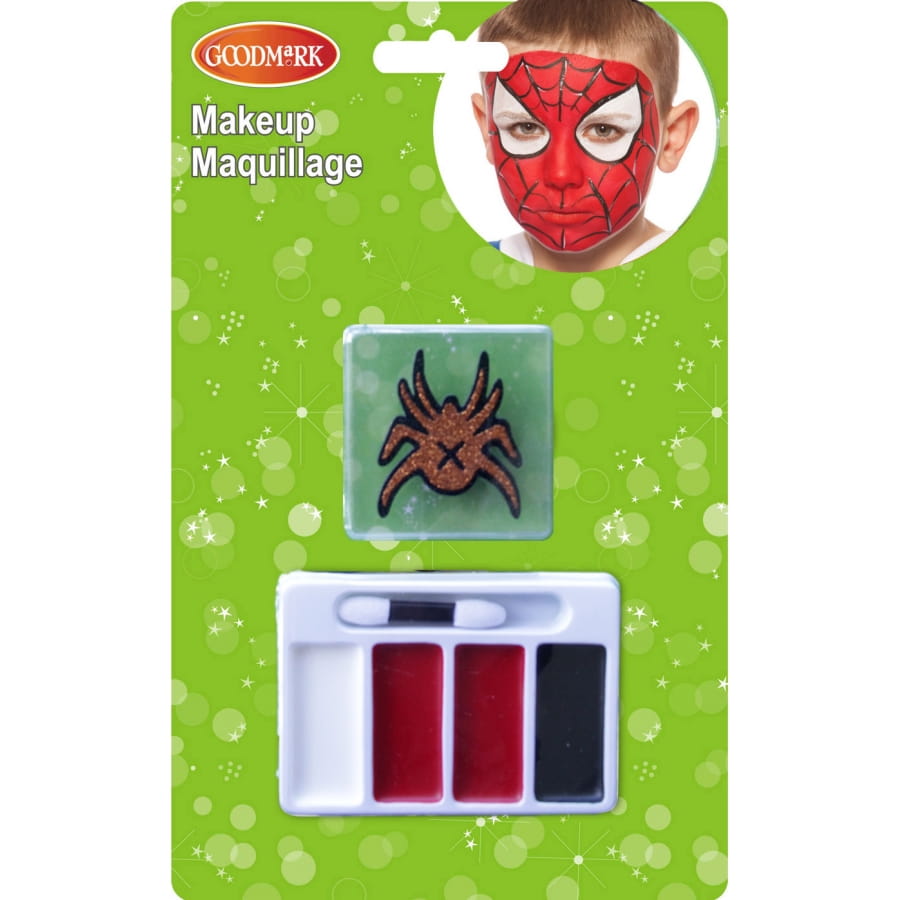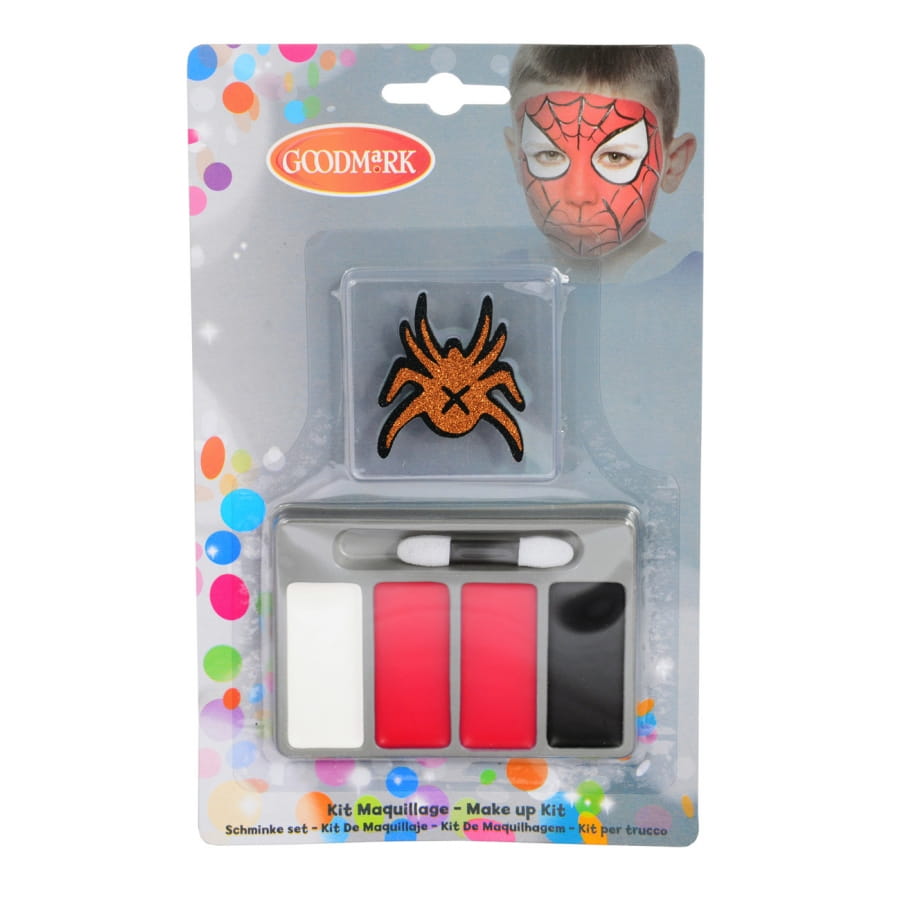 Le petit kit de maquillage araignée est composé d'une palette de maquillage araignée avec 4 couleurs : noir, blanc et deux mêmes teintes de rouge.