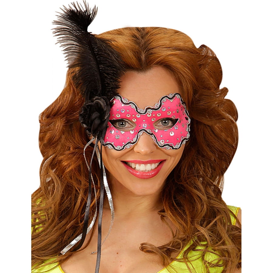Le masque est agrémenté sur le côté d'une fausse plume noire fixée à une rose en tissu.
