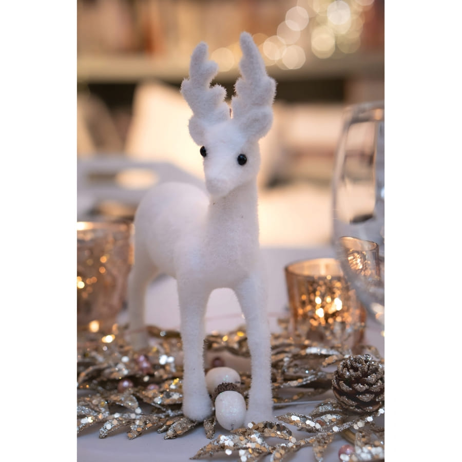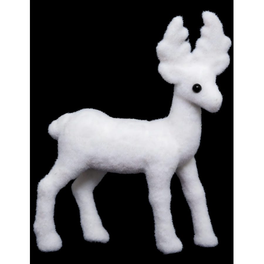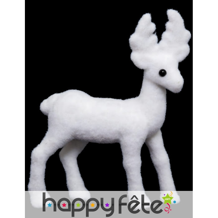 Entièrement blanc, ce renne est recouvert d'une sorte de petit duvet blanc, donnant un effet neige qui évoque la douceur et la fraicheur des fêtes de fin d'année enneigées. Ses deux yeux noirs contrastent avec sa blancheur immaculée, lui conférant une touche de caractère.