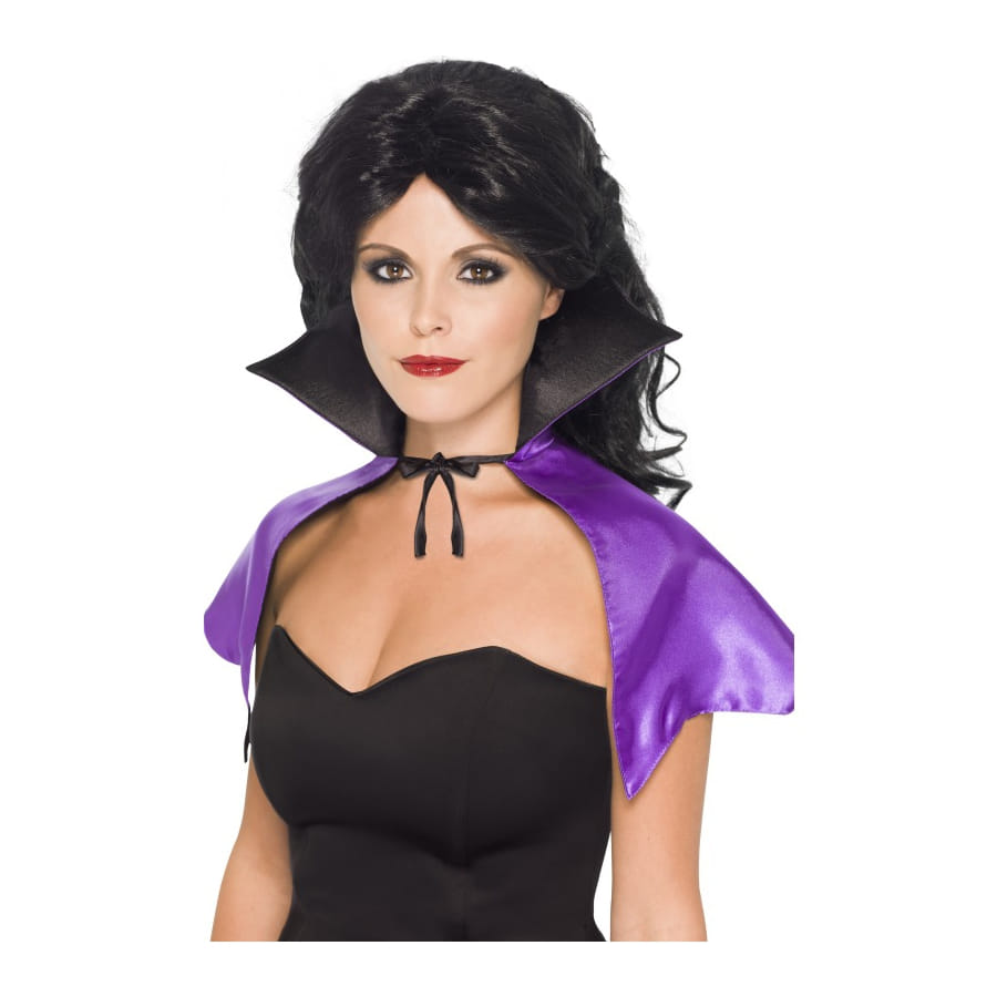 Superbe mini-cape de couleur noire et violette, pour femme ou fille. Avec son grand col à revers noir, cette cape vous donnera un air diabolique, idéal pour un déguisement de sorcière ou de vampire pour Halloween.