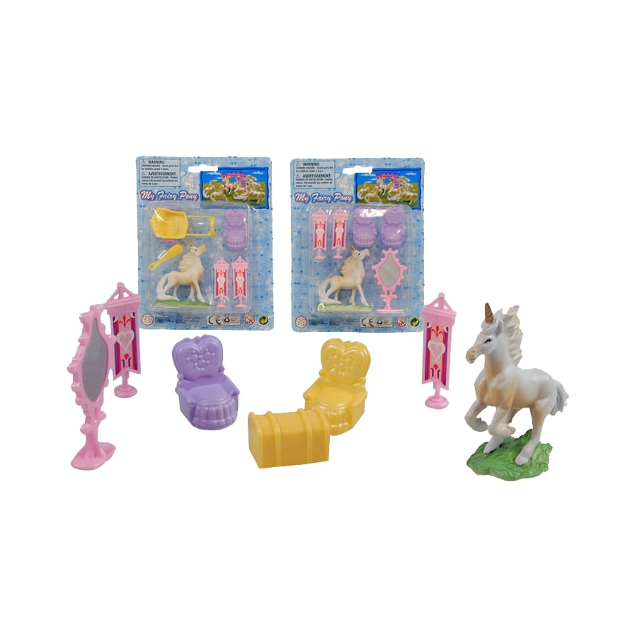 Elle va adoré jouer avec cette magnifique licorne et ces accessoire. La licorne est blanc avec ces accessoire qui sont multicolores. Des accessoires comme un miroir, deux canapé,une malle. La licorne fait 8 centimètre.